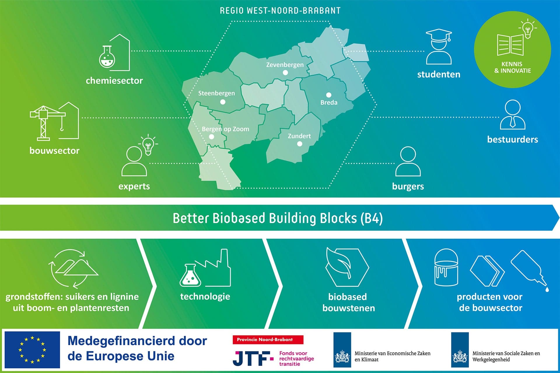Het helpen van regio’s die sterk afhankelijk zijn van fossiele industrieën met de transitie naar een klimaatneutrale economie op een rechtvaardige en gelijkwaardige manier; dat is het doel van het Just Transition Fund van de Europese Unie. Het B4 project wil van West-Noord-Brabant een hotspot maken op het gebied van biobased bouwstenen voor de bouwsector. West-Noord-Brabant heeft hier in potentie alles voor in huis: restproducten uit de landbouw zoals suikerbietenpulp als groene grondstof, een chemische sector met veel kennis en personeel en sterke logistieke verbindingen. De B4 projectpartners willen duurzaam economisch perspectief bieden aan de regio door het bieden van een nieuw verdienmodel voor de agrarische sector en het creëren van extra banen in de chemische industrie.